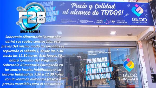 Este jueves 30, habrá jornadas del Programa Soberanía Alimentaria Formoseña en los cuatro locales habilitados en su horario habitual de 7.30 a 12.30 horas con la venta de alimentos frescos a precios accesibles para el consumidor.