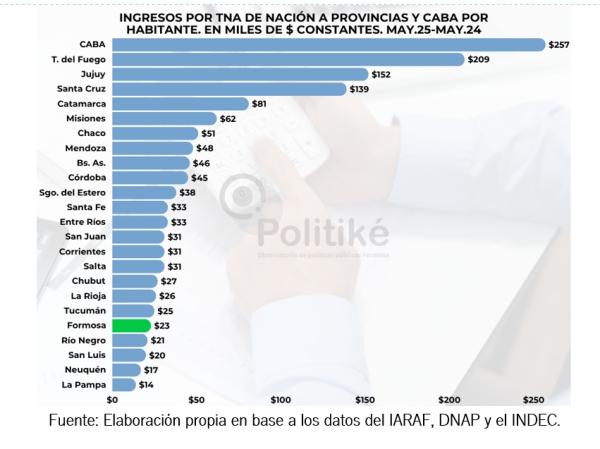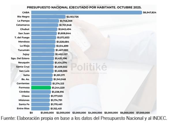 Por otra parte, y tomando como fuente los datos proporcionados por el sitio oficial de Presupuesto Abierto de Argentina.gob.ar y la estimación poblacional del INDEC, desde POLITIKÉ explicaron que Formosa continúa el año 2.025 ubicándose como una de las provincias que menos recursos nacionales recibe por habitante en 2025. En contraste a esta situación, se puede observar cómo la Ciudad Autónoma de Buenos Aires es la jurisdicción que más recursos recibe por habitante, reflejando la asimetría con el resto de las jurisdicciones.