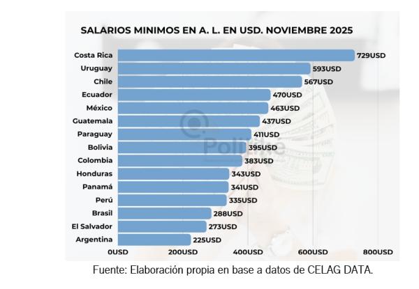 El salario mínimo vital y móvil en la argentina atraviesa una situación de perdida abrupta en comparación con el 2023, según el Centro de Economía Política Argentina el salario se encuentra casi 60% por debajo del promedio de 2023. La relevancia del SMVM es crucial debido a que fija el piso salarial, además de servir como referencia para otras prestaciones, para actualizar montos de programas sociales y en ocasiones determina el valor de la cuota alimentaria. Por otra parte, al observar el salario mínimo mensual en dólares en países de América Latina en el mes de noviembre del 2025, se puede apreciar que la Argentina gobernada por Javier Milei fue el país con el salario mínimo más bajo de la región el mismo fue de USD 225. En el otro extremo de países se encuentra Costa Rica, país que tuvo un salario mínimo de USD 729 siendo el más alto de la región.