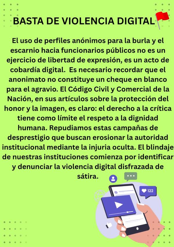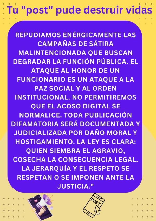 "La libertad de expresión es un derecho fundamental, pero no es libertad de injuria. Atacar el honor de los funcionarios y sus familias mediante la burla, el "escrache" y la mentira no es opinión: es un acto de cobardía digital que daña la paz social", sentenciaron.