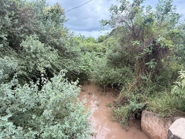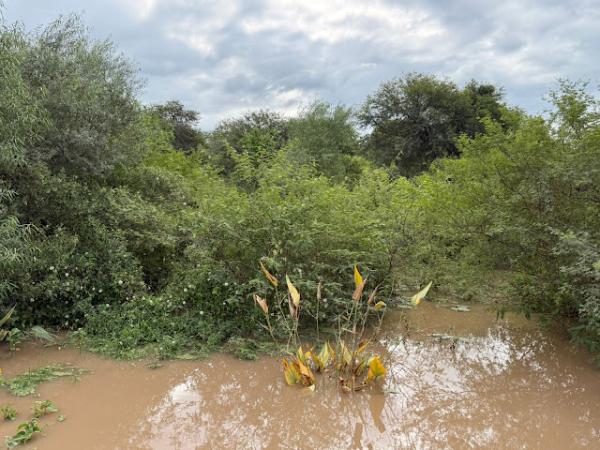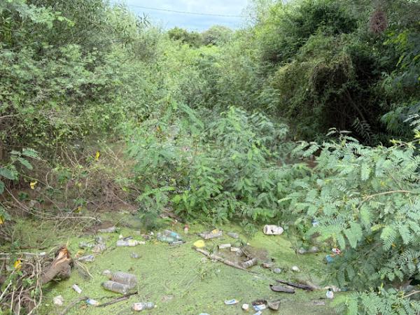 Meza señaló que, en la intersección de las calles Eva Perón e Isla Malvinas, se encuentra el madrejón, afluente natural y uno de los desagües de la localidad, que está completamente tapado por malezas y sedimentos.