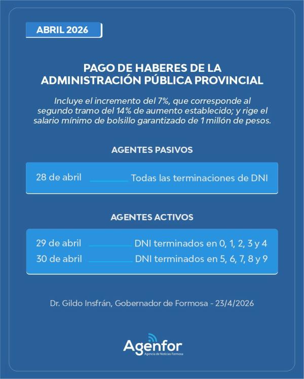 El Ministerio de Economía, Hacienda y Finanzas del Gobierno de la provincia de Formosa informó que a partir del martes 28 se dará inicio al pago de las remuneraciones del mes de abril, con el incremento salarial del 7%, completando el 14% anunciado por el gobernador Gildo Insfrán.