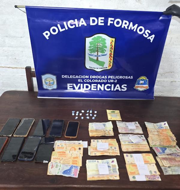 Investigadores de la Delegación Drogas Peligrosas El Colorado desarticularon un centro de distribución de estupefacientes, detuvieron a tres personas y secuestraron cocaína, dinero, teléfonos celulares y otros elementos.